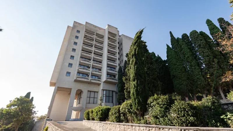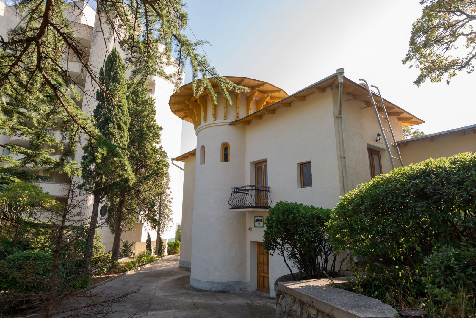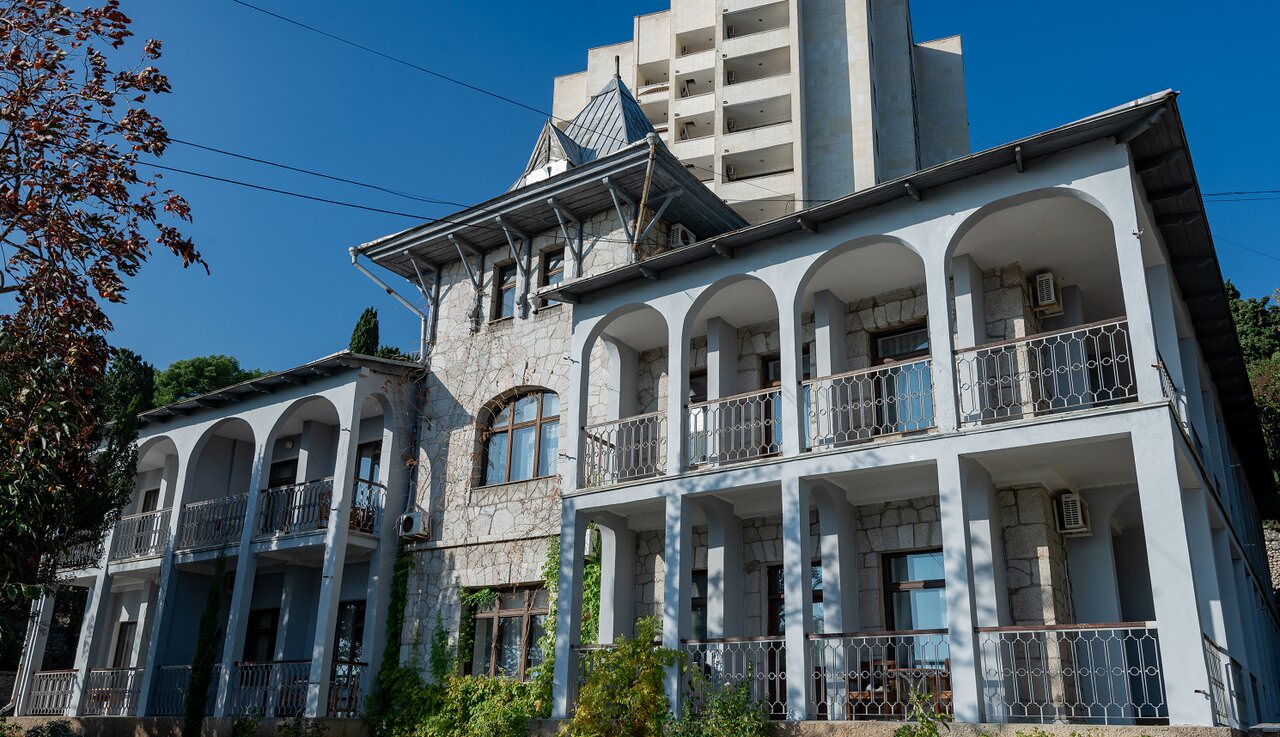 Санаторий расположен на самом берегу моря, в непосредственной близости от Воронцовского дворца и канатной дороги на гору Ай-Петри.