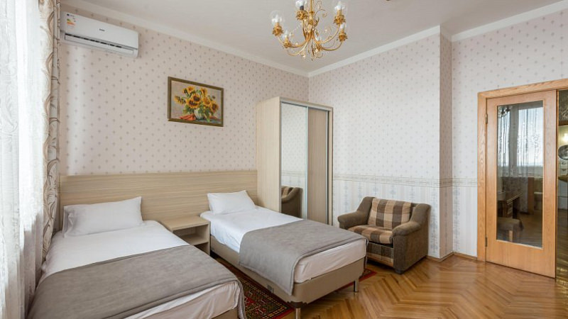 Площадь номера - 22 кв.м. 1 комната. 2 осн. места. вид на море. В номере: телевизор; холодильник; балкон; кондиционер; ванна; умывальник; туалет; фен; 1-спальные/ 2-спальная кровать; чайник. 1 доп. место: